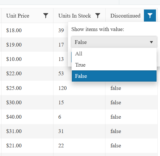 We also need a DropDownList for a boolean column in the filter as described here: