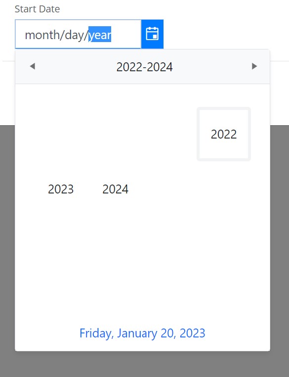 In my date picker, I have a range of available dates from 1/1/2022 - 12/31/2024. When I open the date picker and drill back to the years they look out of place because the first three cells which were likely reserved for 2019 - 2021 are blank. 2022 starts in the middle of the picker and 2024 wraps to the next line. There is a feature with the months to display the disabled days using month.empty and passing an HTML string. I don't see anything like that for year though. Is there either a way to show disabled years or to start with the first year in the first cell of the first row?