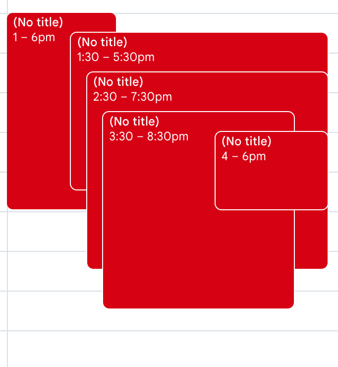 Google Calendar's approach seems to rely on a fixed font size and text height, which we don't have the luxury to assume lightly. And even their overlapping approach doesn't work well if the appointment titles become longer or there is not enough horizontal space: