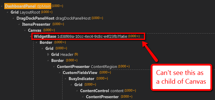 I've attached a picture of the subset of elements I'm working with. I can get a reference to the DashboardPanel element shown at the top of the image, and I can traverse the children up to the Canvas element. When debugging in Visual Studio, however, Canvas shows as having no children whatsoever. I've tried several different tactics for getting the element, but I'm confident none will work as long as Canvas supposedly has no children. Code below. Thoughts?