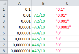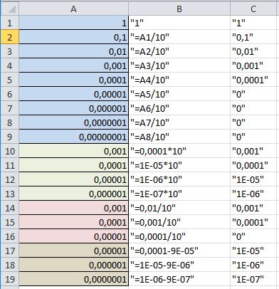 i have trouble reading small numbers from xlsx-files by using the spread processing components. in the attached file you can see an example. column A contains the values i want to read which are computed from row 2 to row 8. the used formula can be seen in column B. column C contains the values that the spread processing is able to read using