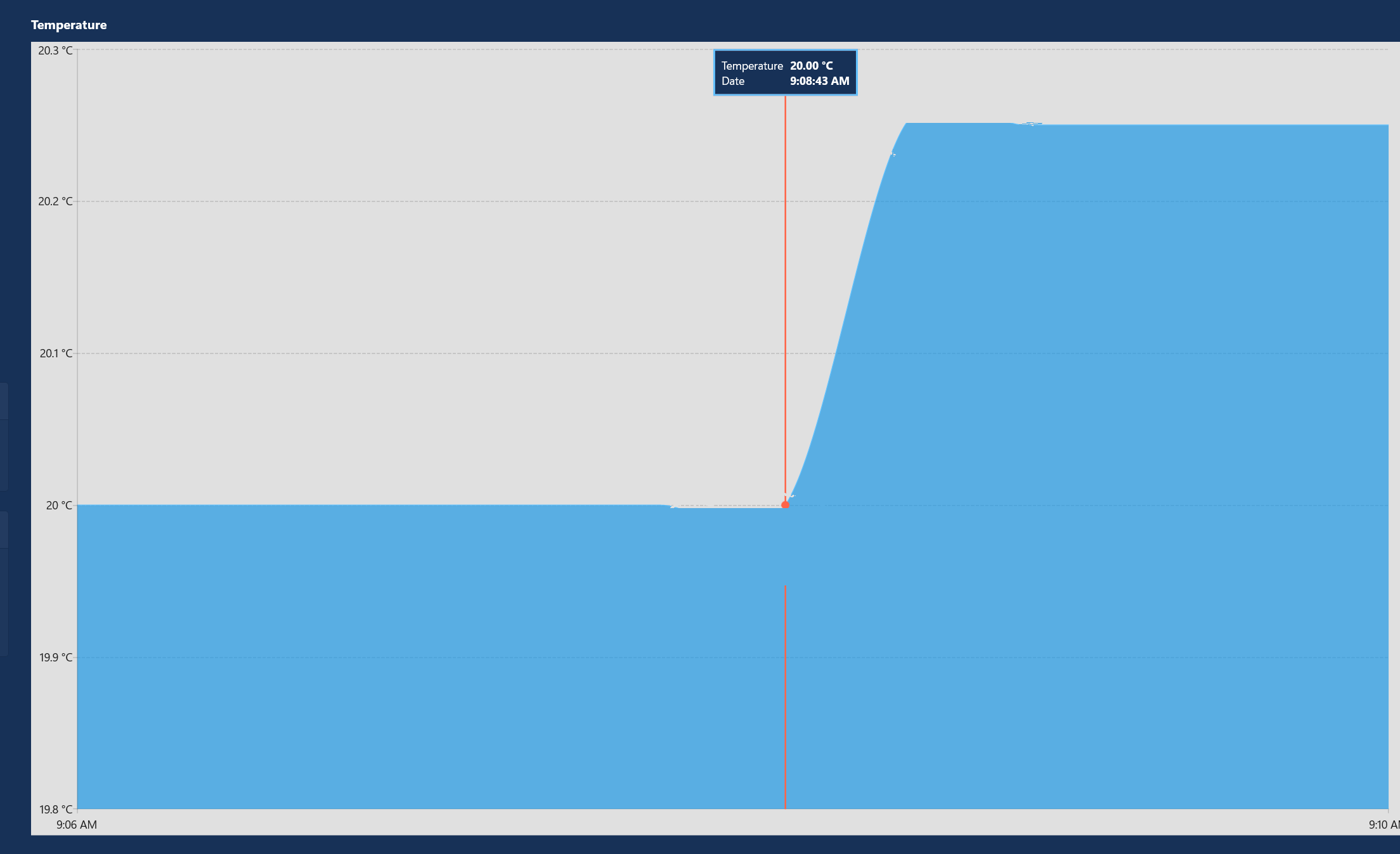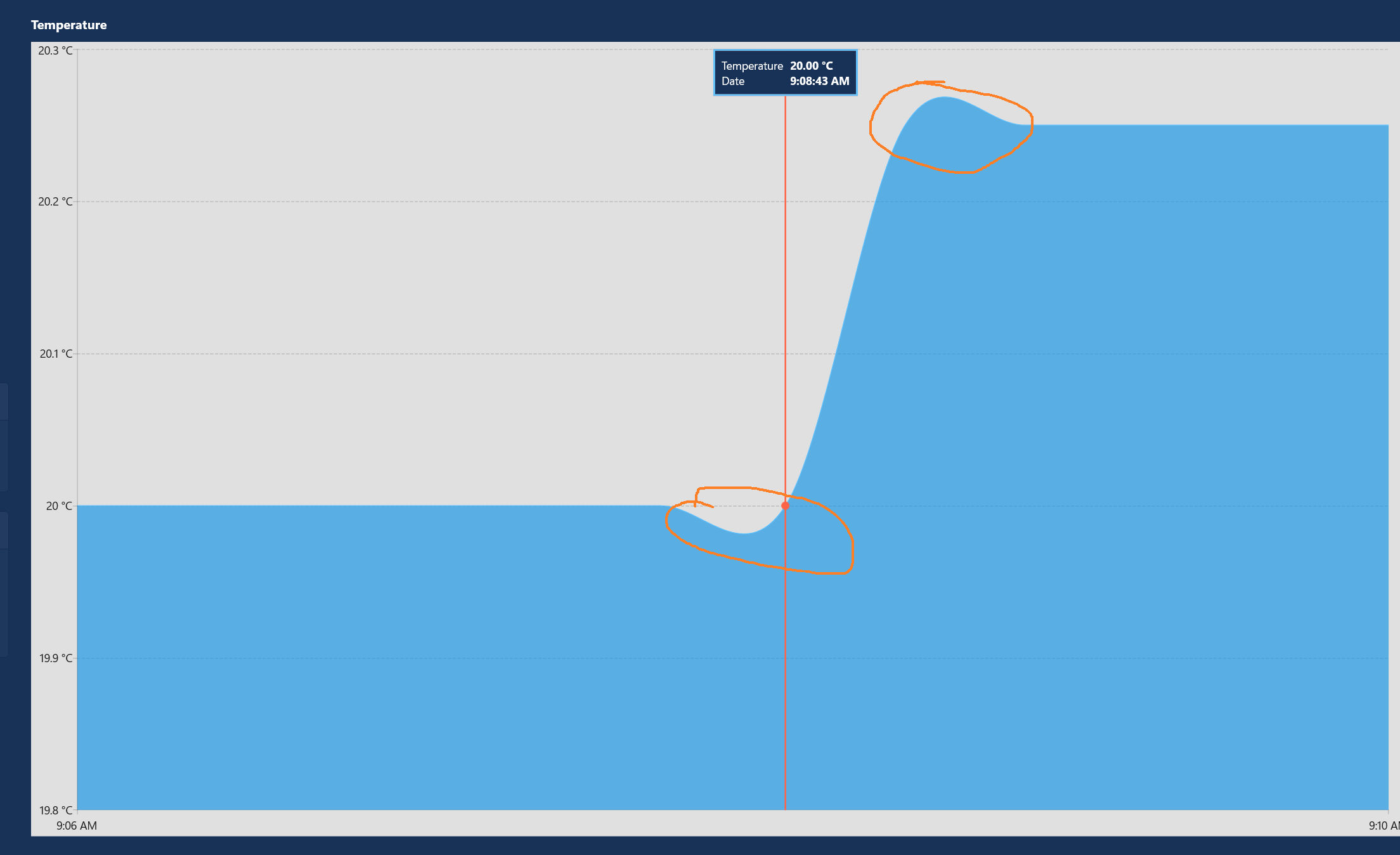 I use a SplineAreaSeries to have a smoother rendering, but as you see in the chart, it gives a misrepresentation of the reality. The chart shows a temperature under 20C and over 20.25C.
