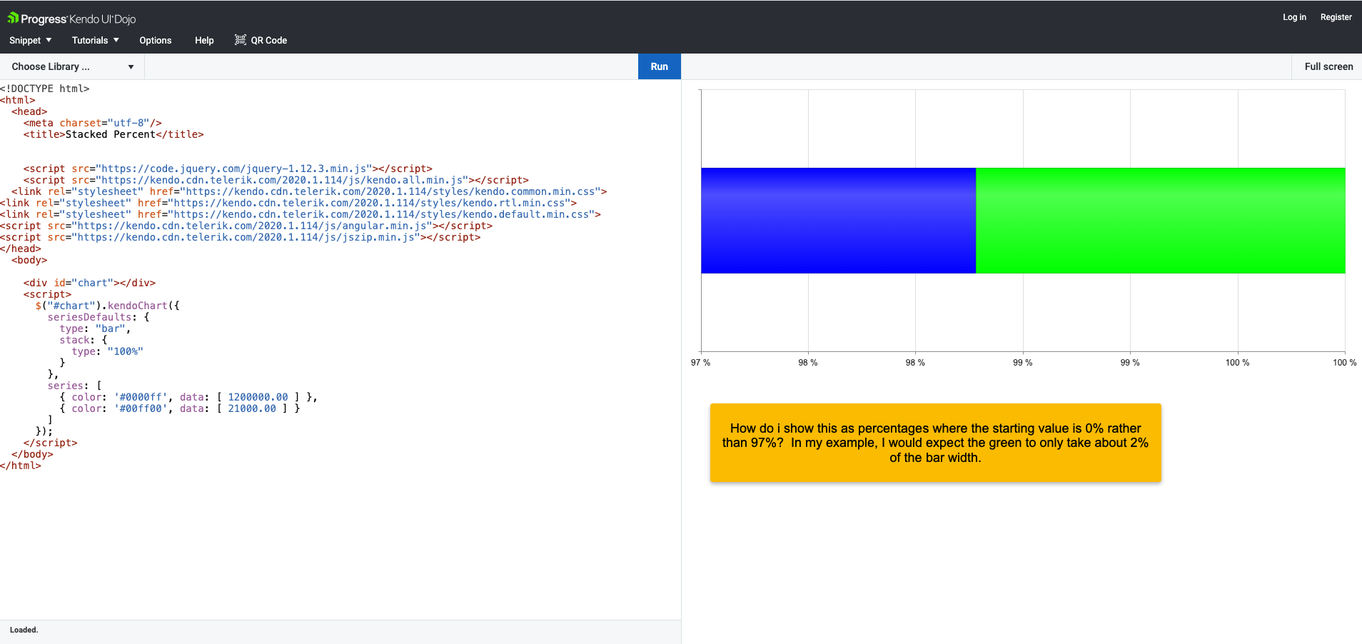 See the attached screenshot and dojo link. How do I show the values as percentages of the total? For some reason, the chart is starting with 97% rather than 0%.