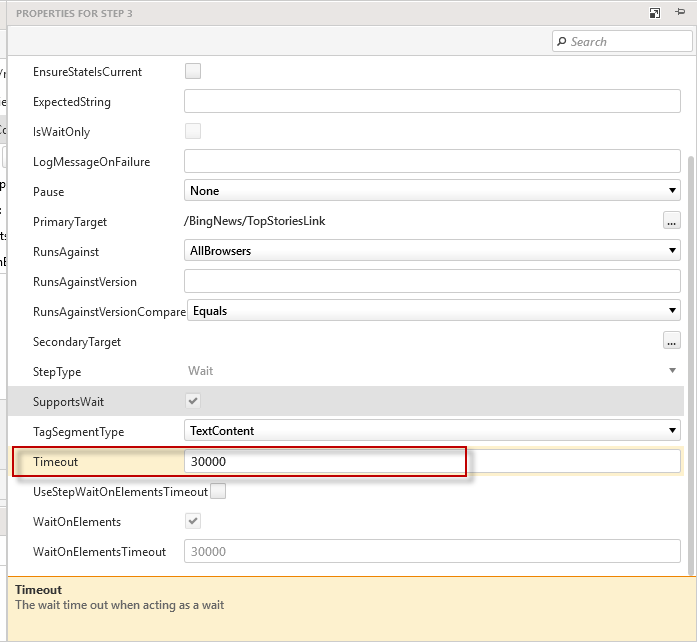 2. If I only use step Time Out (in Step Properties) without enabling UseStepWaitOnElementsTimeOut, then I will hit "Unable to find element by Find Expression" error.