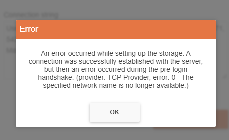 I'm trying to set the storage type to MS SQL Server. It says connection was successfully established but I encountered an error where it cant find the specified network. SQL Server is running while doing the set up. What did I miss?