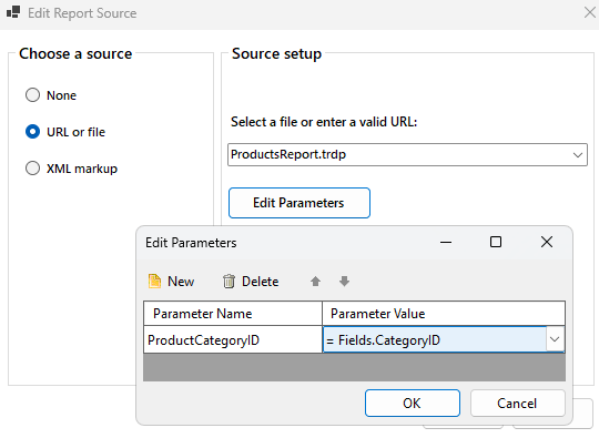 16. Click the Edit Parameters button and link the SubReport parameter (ProductCategoryID) with the master report's CategoryID field:
