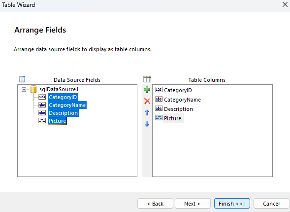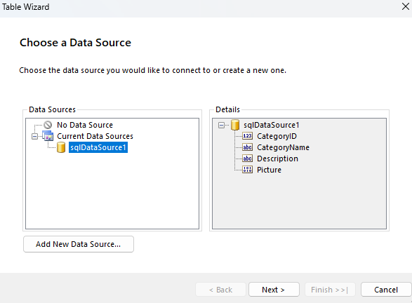 10. Add a new SQL Data Source filled with the Northwind.Categories table: