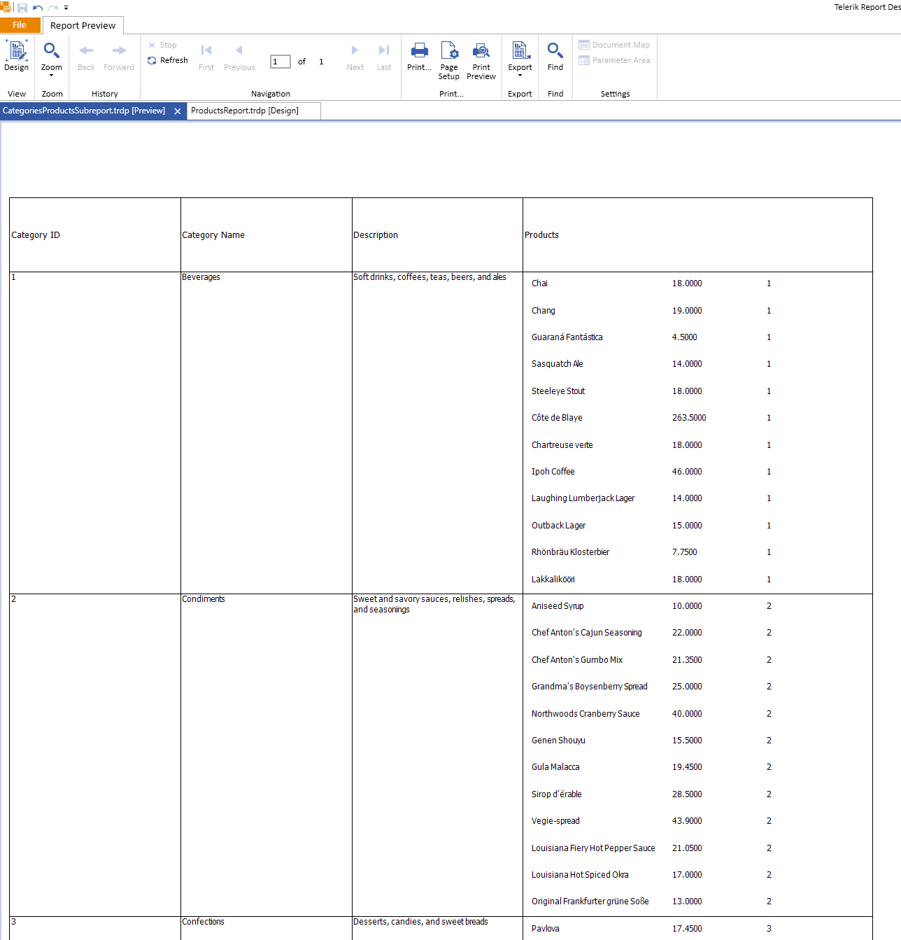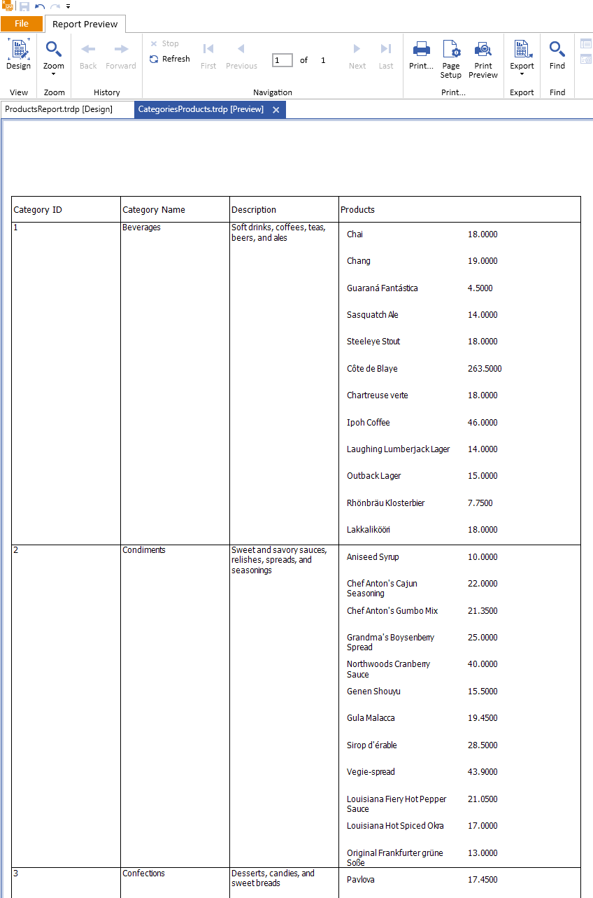 17. Save the changes and preview the master report. You will see all categories listed with the respective products for each category:
