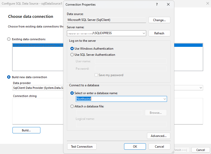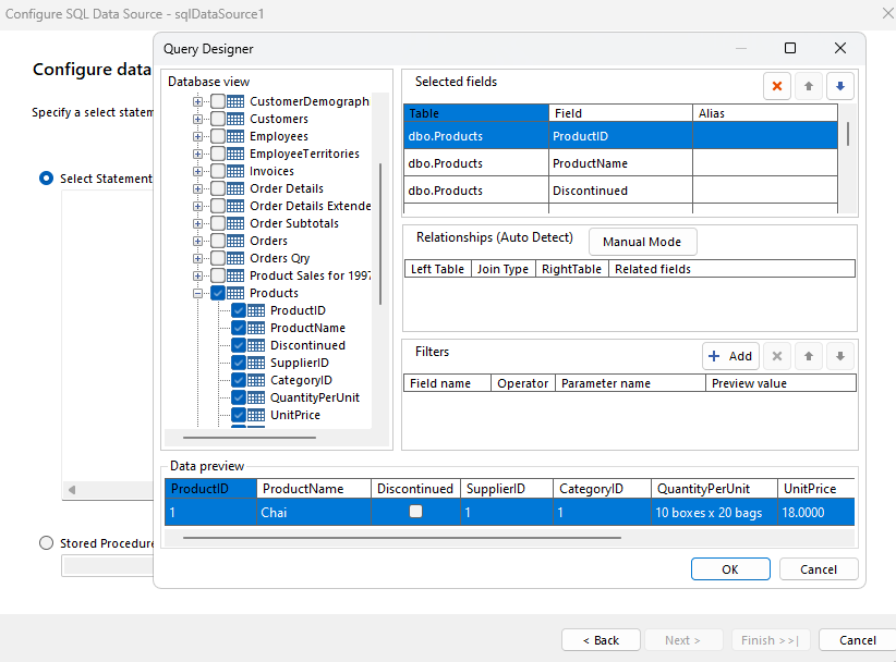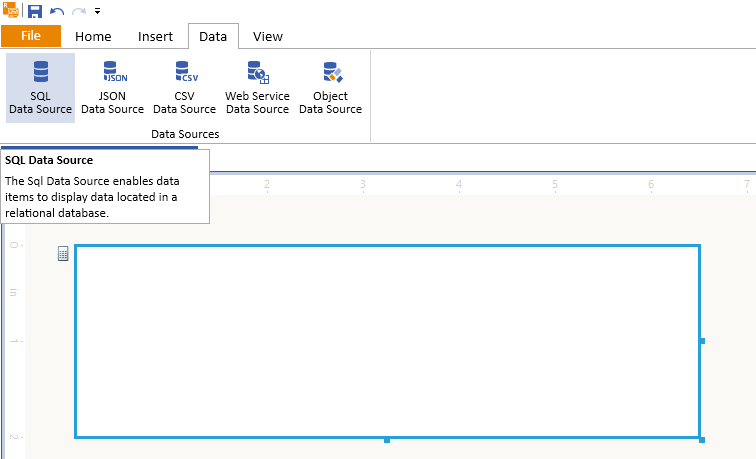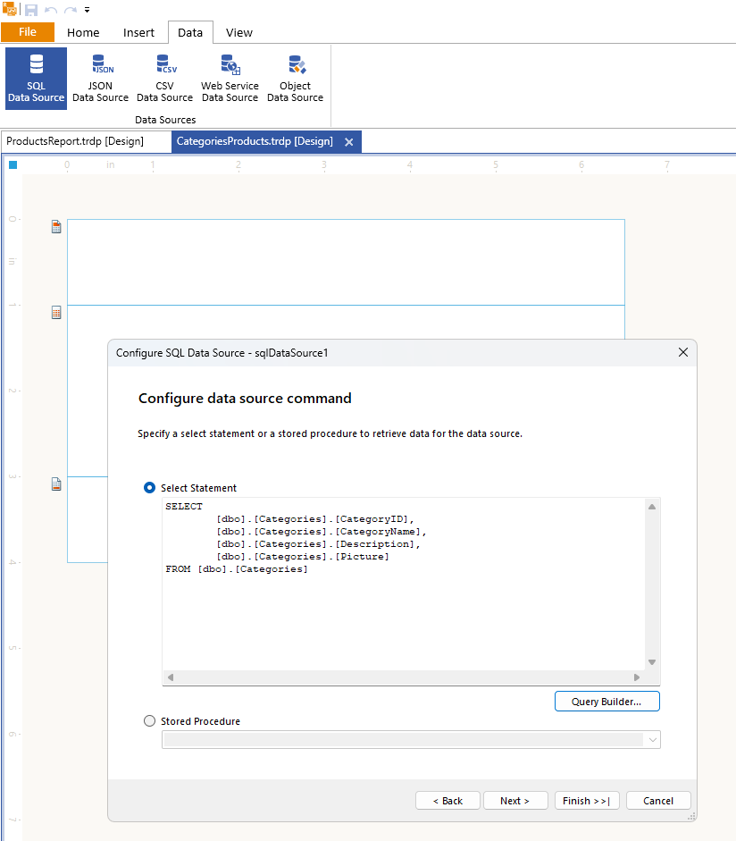 3. Select the Data tab and add a new SQL Data Source populated with the Northwind.Products table: