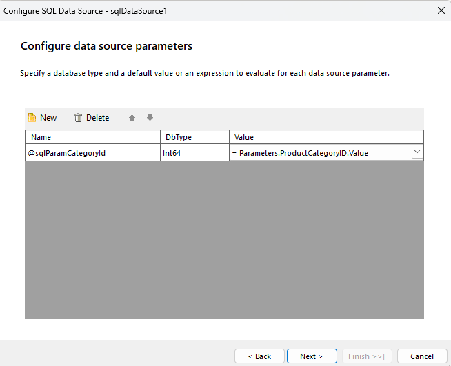 7. Update the SELECT query of the added SQLDataSource and add a WHERE clause using a SQL parameter ( which is mapped to the previously created report parameter):