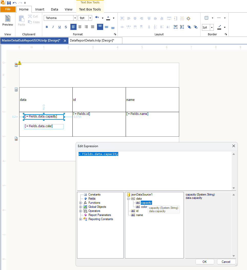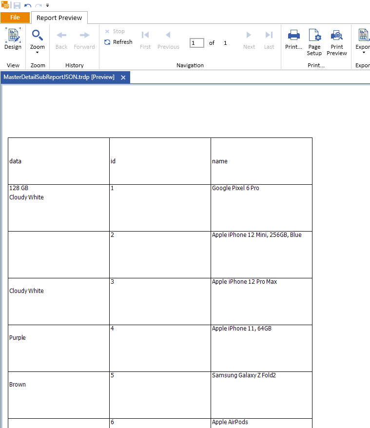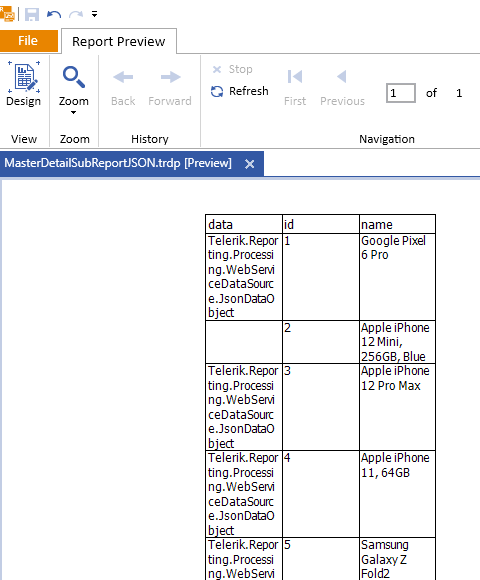 Considering the provided JSON data, I tried the JsonDataSource and the Table wizard in a brand new report . Initially, the observed result: