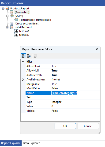 6. Add an integer report parameter ProductCategoryID which will be used for filtering the products: