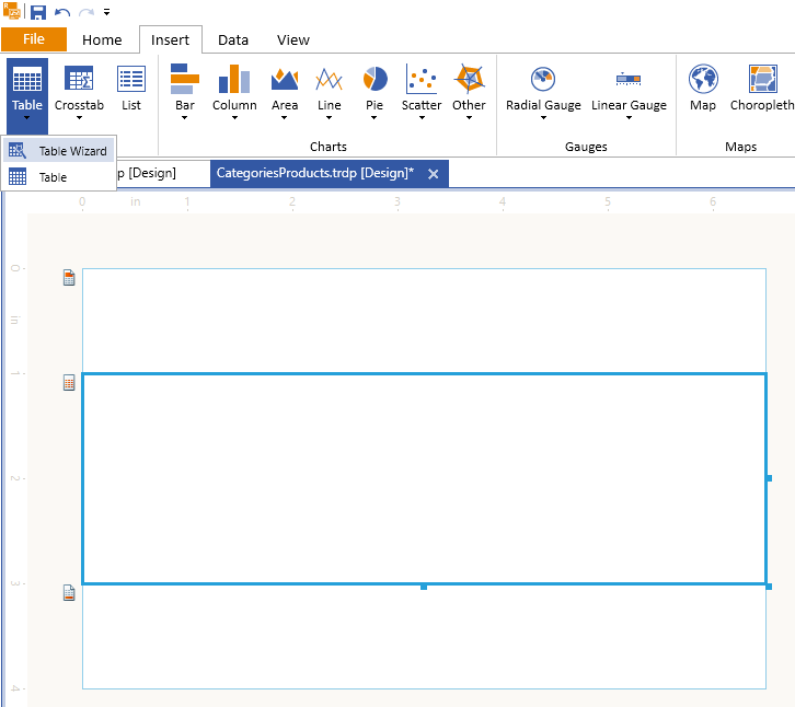 11. Select the report's detailSection and use the Table Wizard to add a table bound to the just added SQLDataSource: