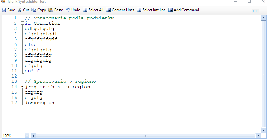 4. Why SyntaxEditor handles new lines as CR and not CRLF? We are on Windows, .NET, WinForms, I expected standard Windows new lines. I changed my CommentLines method to split lines by CR character only, but when I prepare new text by StringBuilder.AppendLine, it adds CRLF to string of course, and when I try to set new selection by new Span created by old selection start and my string length, it selects more characters (if I select 3 lines, it appends 3 more LFs and then string.Length is longer than real span in SyntaxEditor).