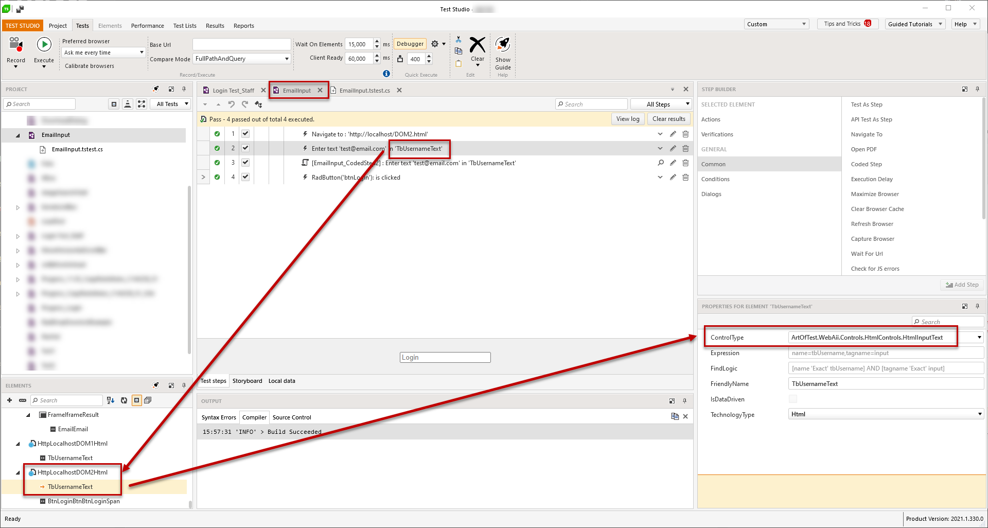 - Change the ControlType of the target element "TbUsernameEmail" to HtmlInputText to match the current state of the application under test. This will not immediately fix the execution of the coded step and if you need to run this code in a coded step rather than the recorded step 3, you need to close all web test and restart Test Studio. That will refresh the references and ControlType that of the changed element.