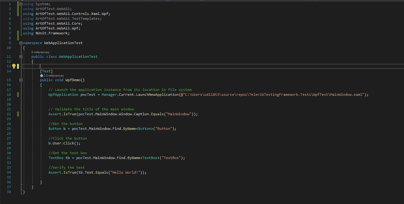 I'm using VS 2019 Enterprise with Telerik Testing Framework. I'm using examples provided by your support document part 'WPF UI Automation'. I have added ArtOfTest.WebAii in the reference and created a test. But when running the test I keep getting the System.NullReferenceException. Can you help me out?