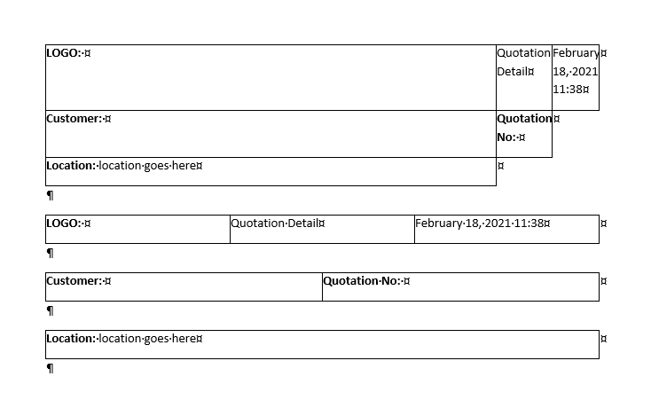 get 100% width, but I am getting extra row between tables. Please take a look on the attached picture. First three tables get merged into one table with three rows. The rest of the tables have correct formatting but they do have extra row in-between.