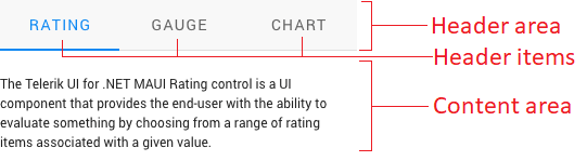 The RadTabView control has two main sections: the header area (of type TabViewHeader) and the content area (of type TabViewContent). The header area is a container for the individual header items (of type TabViewHeaderItem), as illustrated in the following picture: