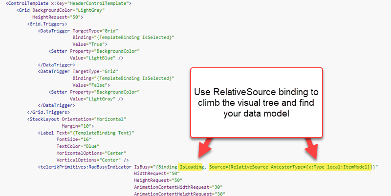 In that KB article, you will see that I have added a BusyIndicator to the header ControlTemplate. In order to operate that BusyIndicator, I bind to my custom data item's IsLoading property through the use of a RelativeSource AncestorType binding.