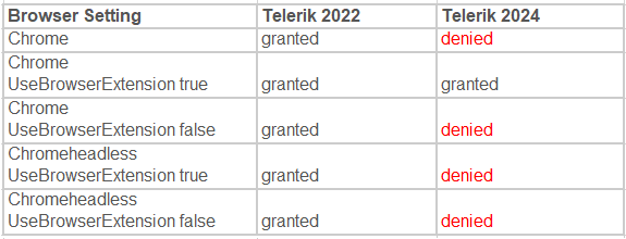 Below is what I have summary for telerik 2024 and 2022, please help to confirm if all the the denied scenarios are expected.