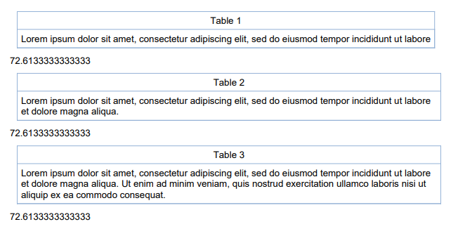 This code creates a document with 3 tables of increasing height. However, when measured each has the same height. How can a table's height be measured in a way that will account for text that wraps onto multiple lines?