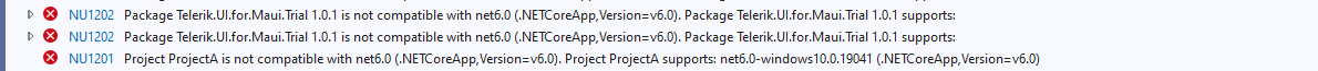 I got a error when we added Telerik.UI.for.MAUI.Trial 1.0.1 reference into my MAUI class libraries, It said Project XXX is not compatible with net6.0 (.NETCoreApp,Version=v6.0). Project XXX supports: net6.0-windows10.0.19041 (.NETCoreApp,Version=v6.0)