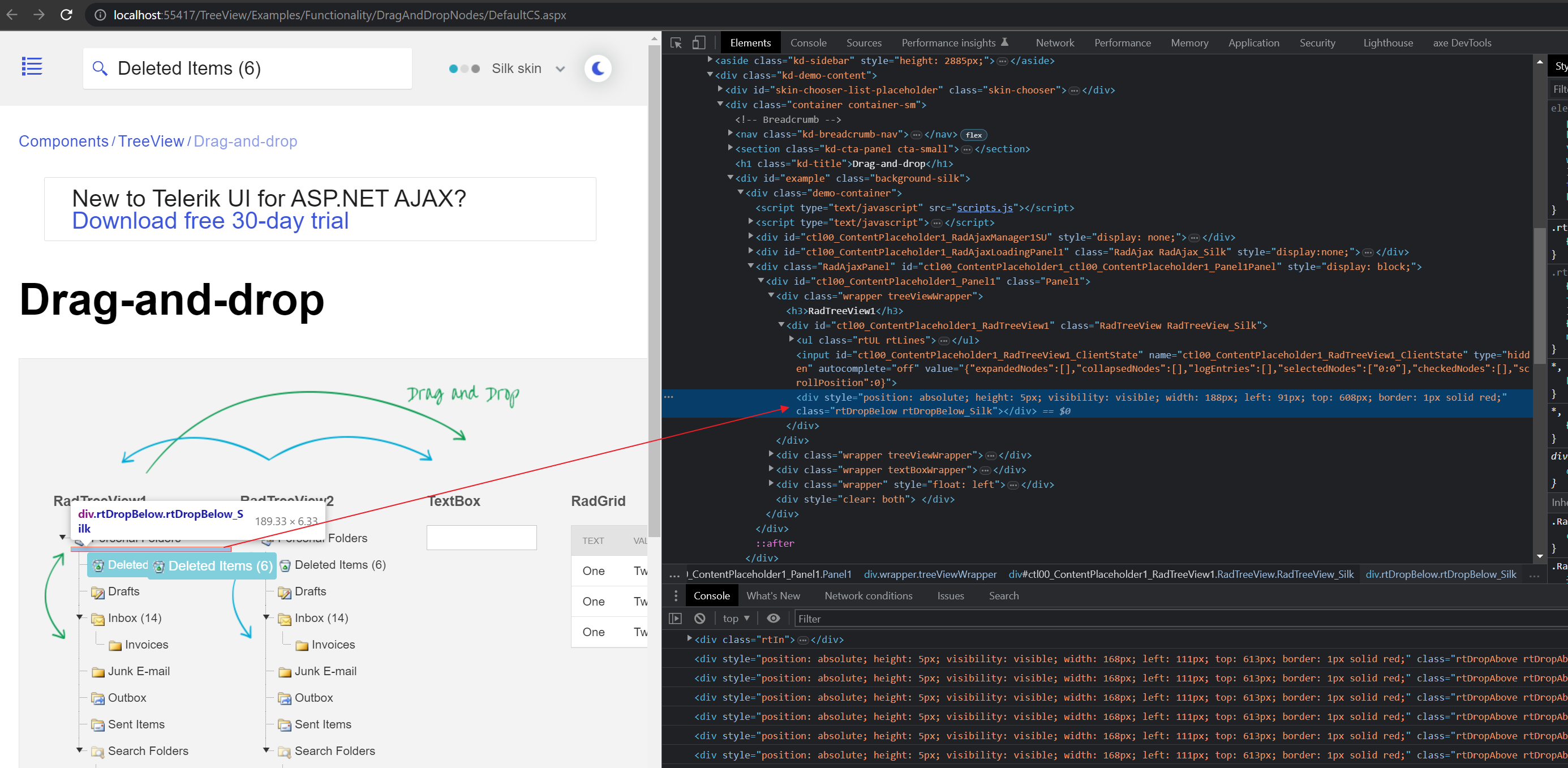 I have 'EnableDragAndDropBetweenNodes' property to true in my telerik control. In the run time I am also adding parent node. When I drag an item and hover on other item, I see dotted line (below or above the item) which indicates the position of insertion. When I drag an item and hover on parent node, I can also see dotted lines.