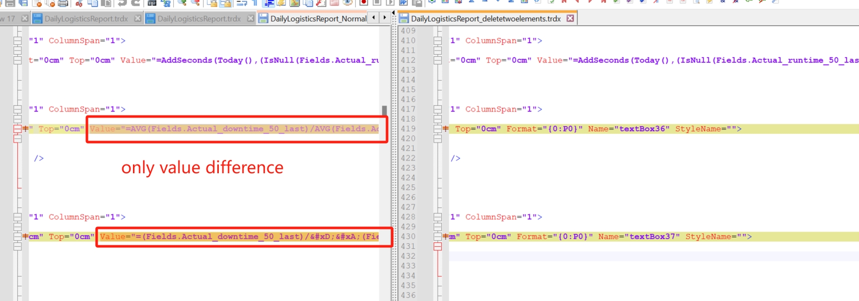 <TextBox Width="1in" Height="0.7cm" Left="0cm" Top="0cm" Value="=AVG(Fields.Actual_downtime_50_last)/AVG(Fields.Actual_runtime_50_last)" Format="{0:P0}" Name="textBox36" StyleName="">