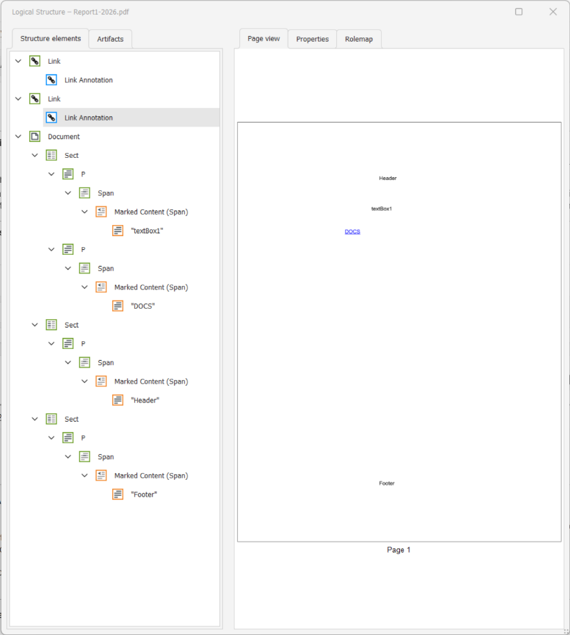 var result = reportProcessor.RenderReport("PDF", reportSource, deviceInfo);After rendering document, document has accesability features but PAC (PDF checker for accesability) reports accessibility warnings related to tagged content structure.