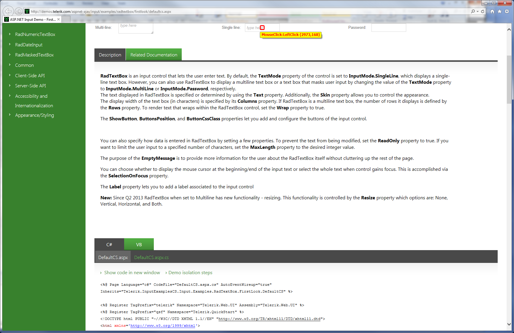 When I attempt to do this I can see that the text is written (If I look closely) but then I get MouseCLick;LeftCLick and timeout waiting for the text. See RadControlsWebApp3_RadTextBox.pdf in zip file (actually real project not sample given which exhibits same problem)