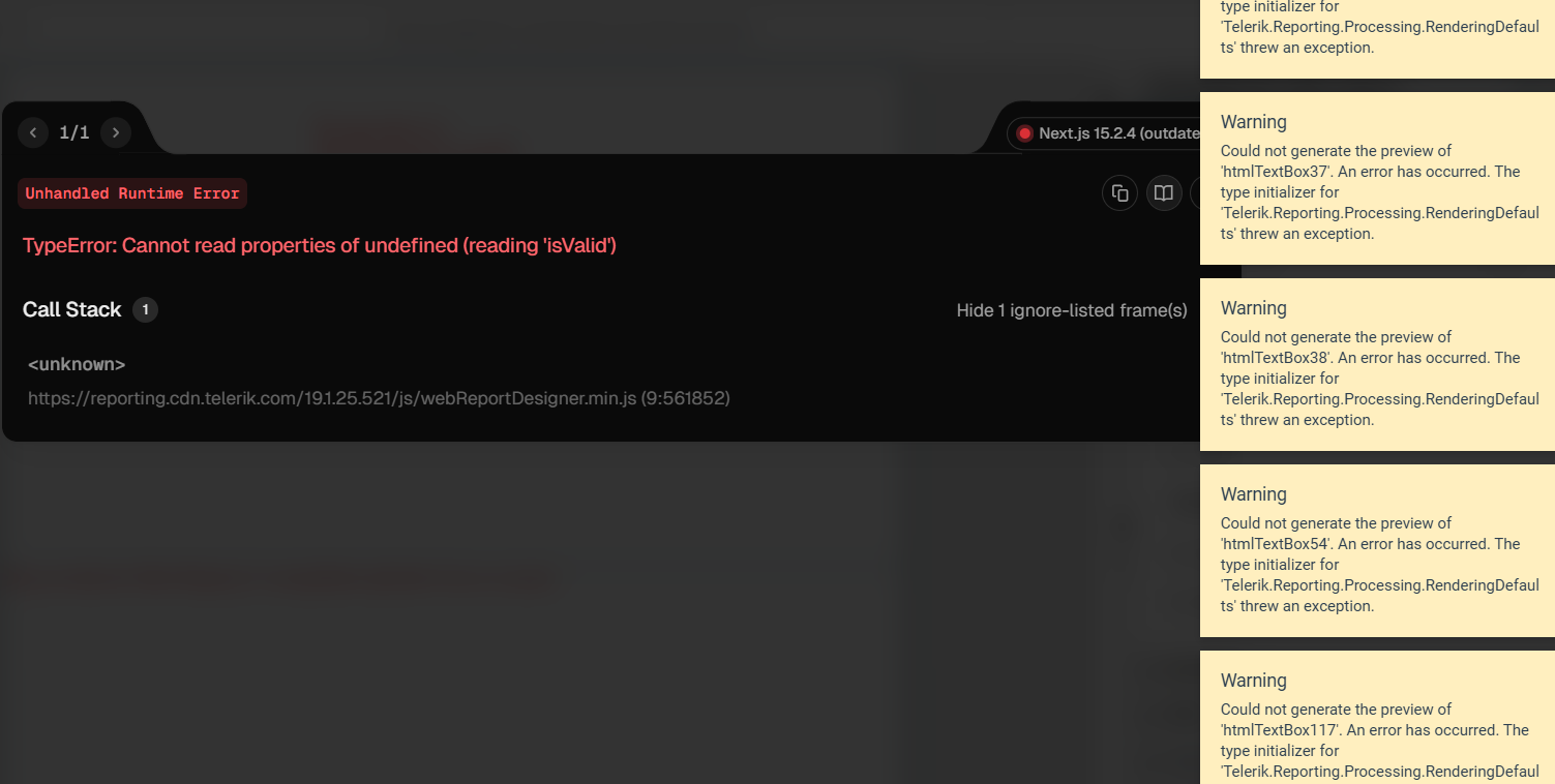 I am using Telerik web reporting, and its givingan undefined isValid error on my web reporting designer.