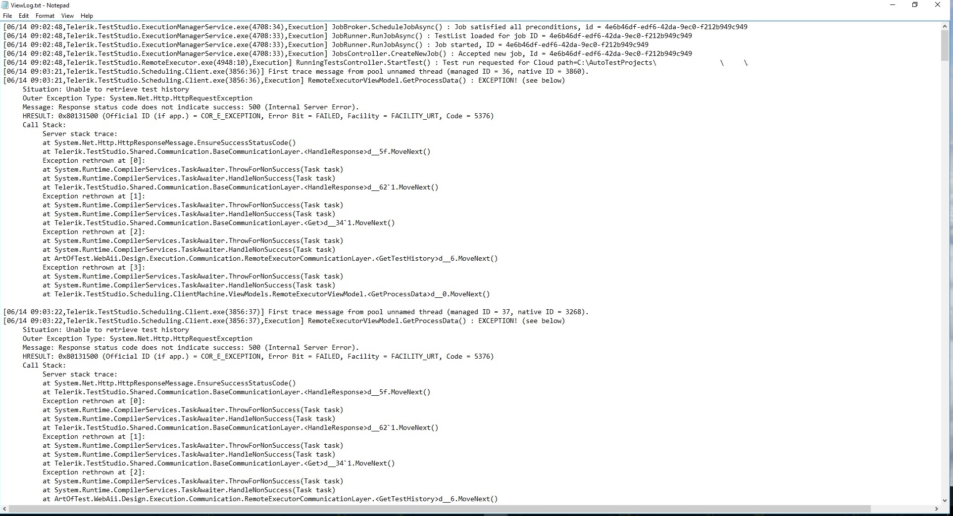 [04/30 15:45:51,Telerik.TestStudio.ExecutionManagerService.exe(6736:10),Execution] JobsController.CreateNewJob() : Accepted new job, Id = 6002ea3b-d6d1-43be-b57a-dd382767f23f