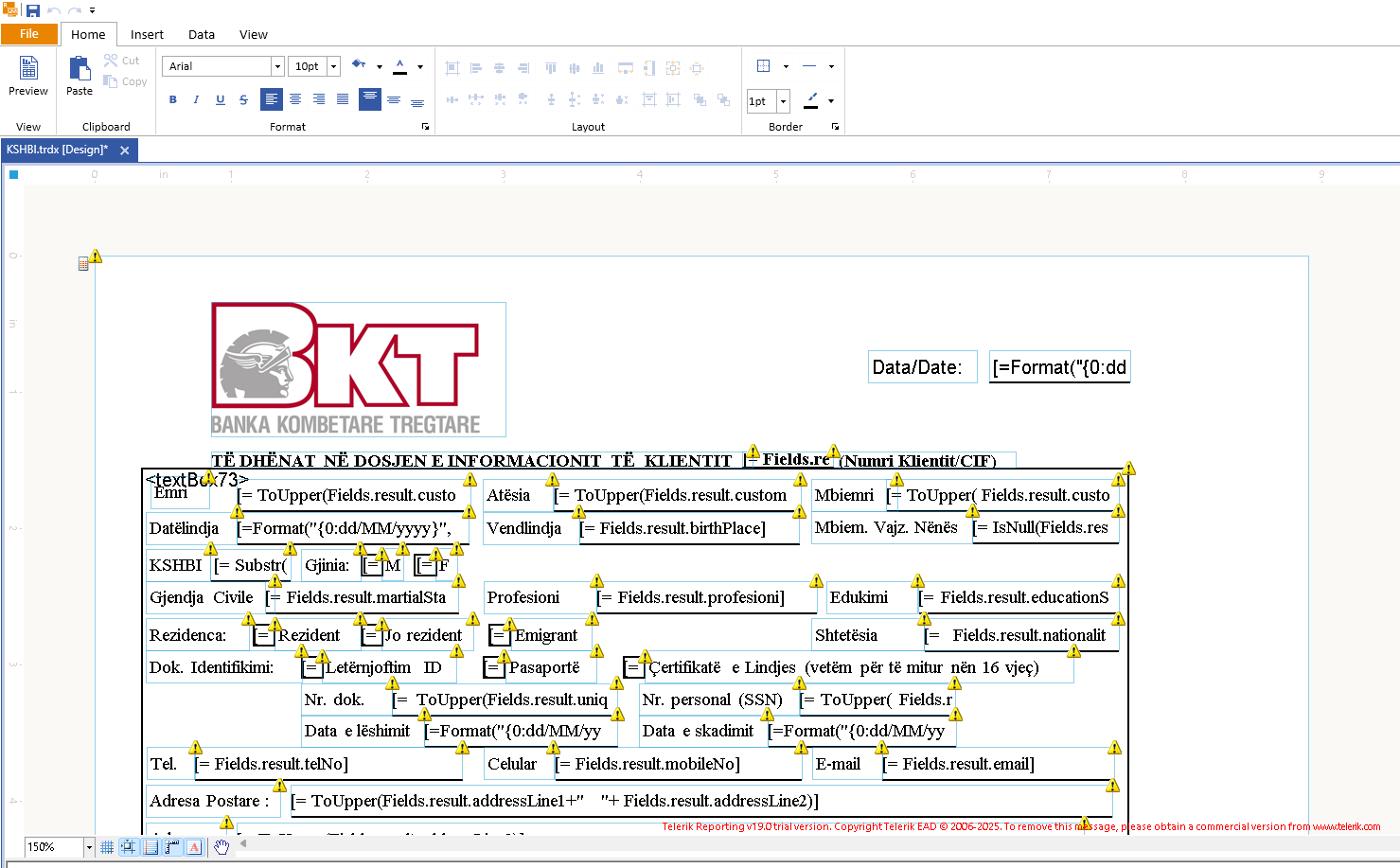 In the red Trial message from the Standalone Report Designer screenshot, I see Telerik Reporting version 19. There is no indication of the designer being connected to a Report Server. Do you use Telerik Reporting for building your application that exports PDF documents? If so, do you use the Skia graphics engine (see processing Element) on Linux when deploying on Kubernetes? What is the exact Reporting version on your application? We are aware of issues with Skia, and some of them have already been addressed in our latest releases.