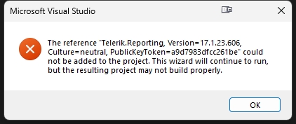 The reference "Telerik.Reporting, Version=17.1.23.606, Culture=neutral, PublicKeyToken=a9d7983dfcc261be" could not be added to the project. This wizard will continue to run, but the resulting project may not build properly.