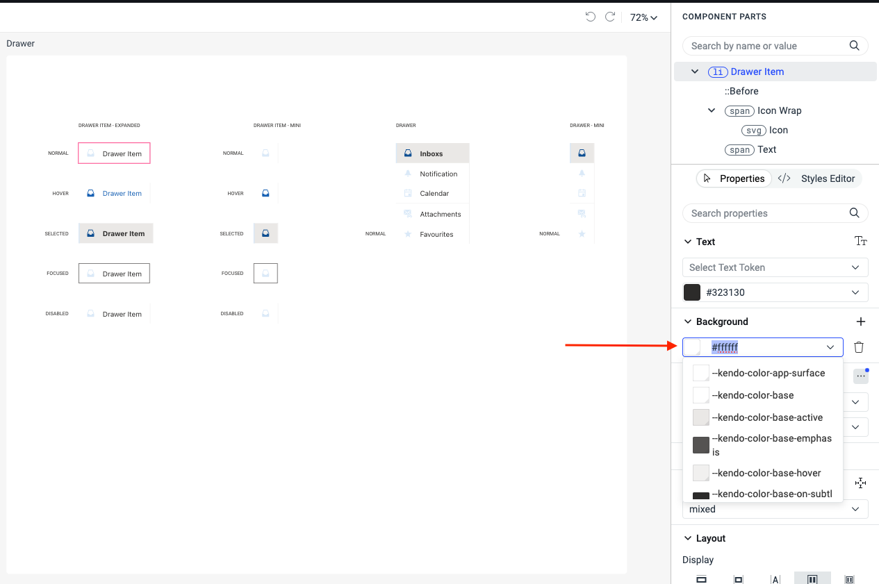 background-color: var(--kendo-drawer-item-bg, var(--kendo-component-bg, initial));It turns out that --kendo-drawer-item-bg isn't actually defined anywhere in ThemeBuilder or anywhere else, so we added it as a custom variable. Unfortunately, when the CSS is generated, the variable is generated with a tb- prefix and thus isn't picked up by the standard background-color style definition above. Yet it shows in the ThemeBuilder correctly!