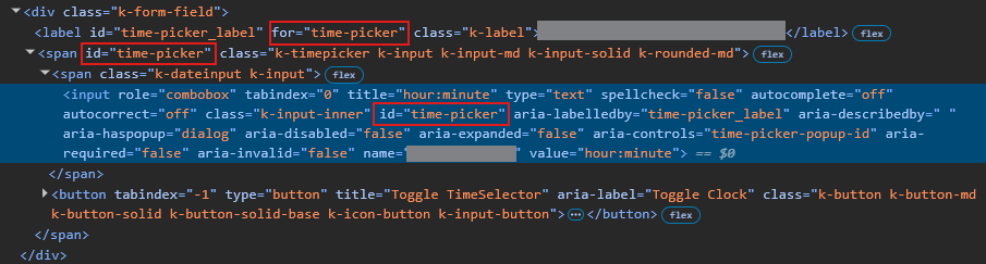 />The generated HTML rendered to the DOM includes a span which has the ID attached to the TimePicker component, as well as the input control element which bears the same ID. This poses a screen-reader accessibility issue given that the label element's "for" value needs a unique ID.