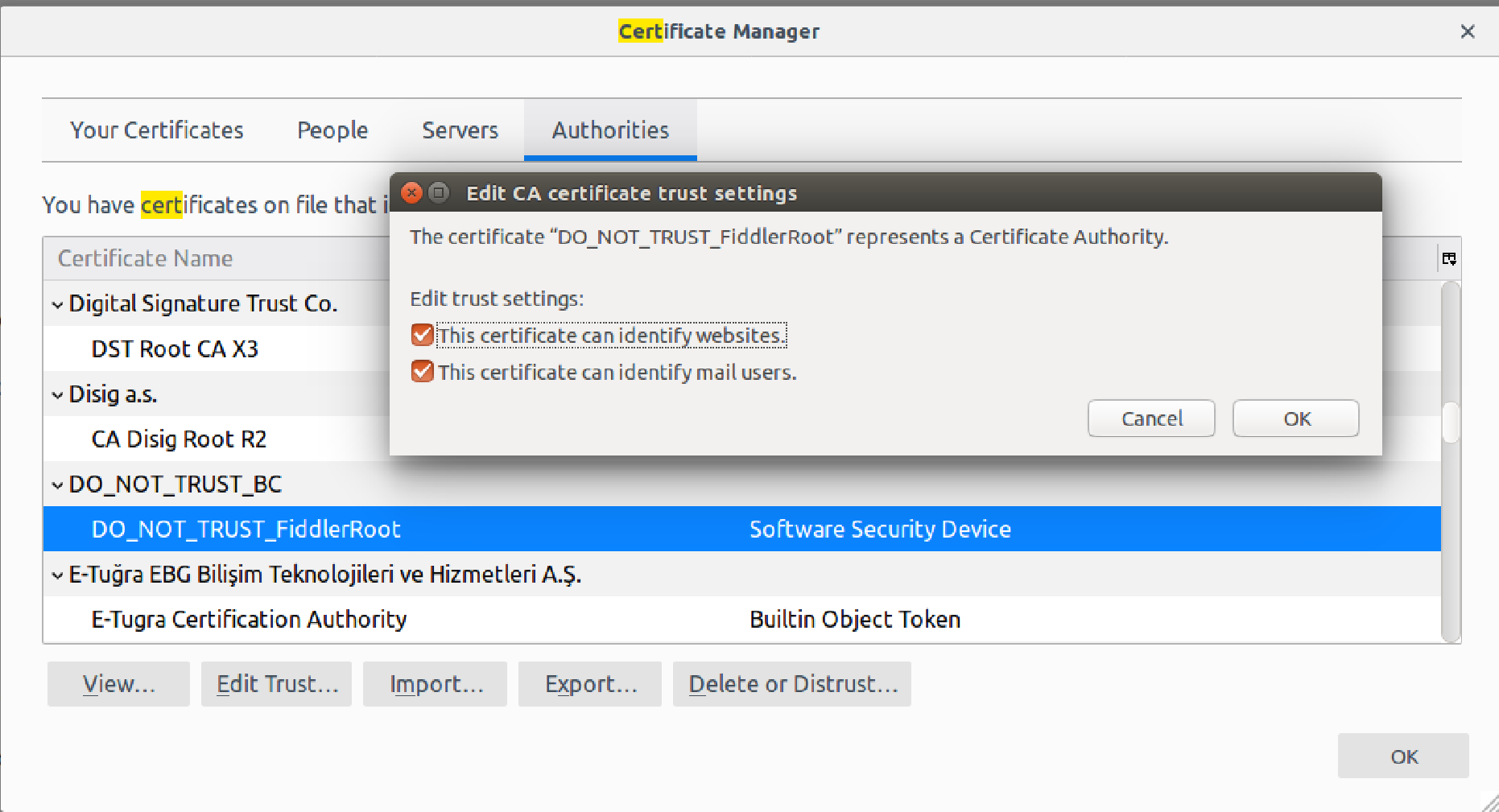 I'm trying to use fiddler v4.4.8.4 in my ubuntu 14.04 virtual machine to capture https connections, and I get "secure connection failed". Of course, when I close fiddler or don't check cature https connects, firefox works well.