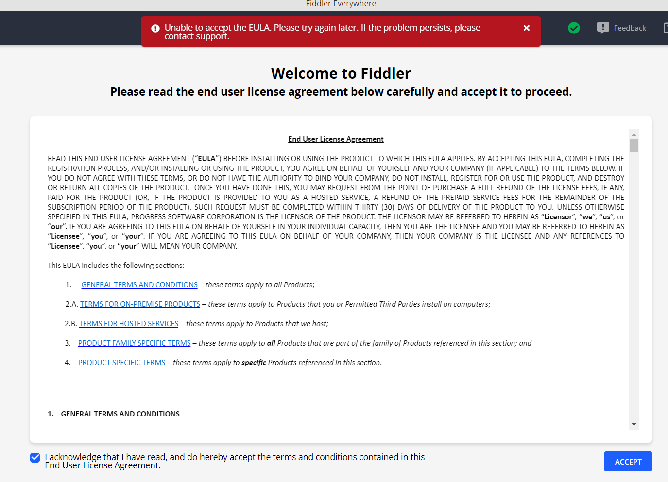 When I click Accept User License Agreement, I get an error, which prevents me from using Fiddler EveryWhere
