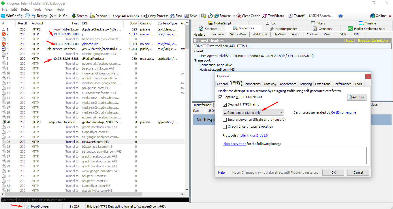 2. Coming to your question on Http sessions, After connecting to fiddler from android i can see all the desired calls/sessions but are going to tunnel.