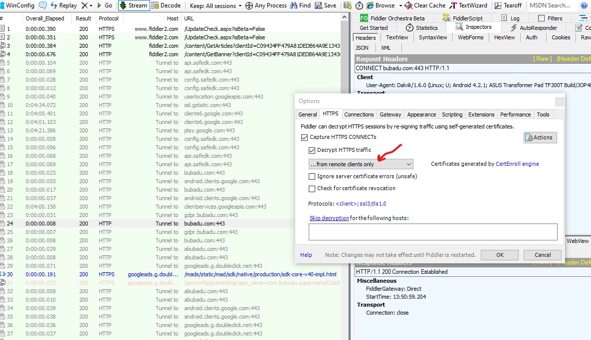 I'm new to Fiddler and would really appreciate your help in capturing HTTPS traffic from a mobile app using my tablet (Android 4.2 OS). After reading the other posts in this thread, I am still unable to capture HTTPS traffic. I see the tunnels, though.