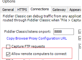 - Fiddler Classic must be enabled to allow remote computers to connect (through Tools > Fiddler Options > Connections > Allow Remote Computers to Connect ).