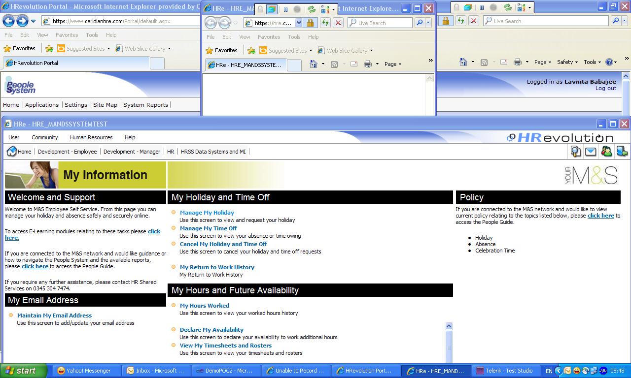 This screen is recognized by Telerik as well. Once in this home screen, I click the “Central HR” button (bordered in green below) and this navigates me to a new window