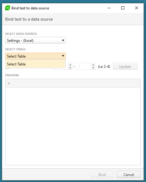Yesterday I was able to bind a excel table to a test but now I'm not able to do that anymore since I can not select the table. See the attached screenshot for that.