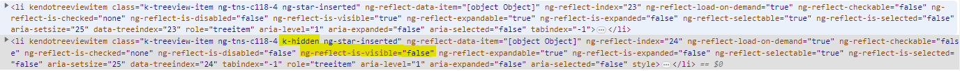 I have encountered an issue when I manipulate the array which I use for [nodes] in my kendo-treeview. When a new item is added to the array, or an old one is updated, they simply disappear from view. Since I knew that the array contained the new/updated item I eventually realized that it was in fact still being rendered in the HTML, just with the added "k-hidden" property - thus not being visible.