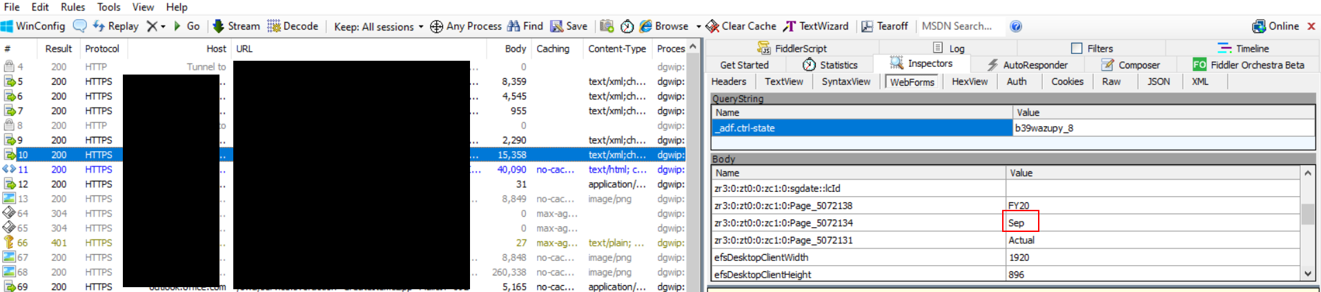 (1) I've tested the function in "AutoResponder". However, I am having trouble finding the settings to change the values I need to update (see screenshot fiddler1.png - I am trying to update the values FY20, Sep, and Actual). The dropdown box I get contains the items below, which I do not believe correspond with the values I need to change: