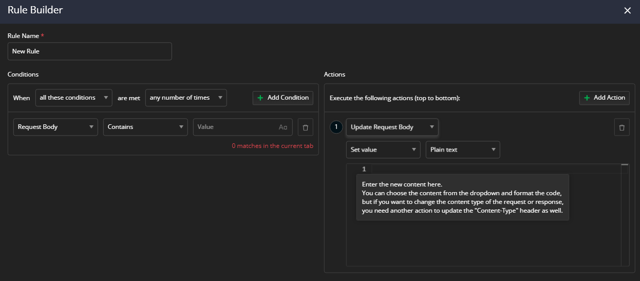 As a side note, you can also try the new Fiddler Everywhere and its Rules tab, which changes how a rule can be created. For example, with Fiddler Everywhere, you could do a rule like this: