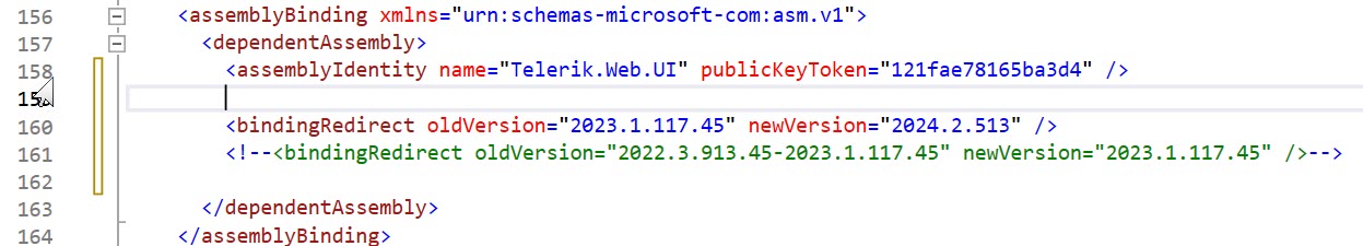 </assemblyBinding>where the newVersion="2024.2.513.462" should contain the last three numbers of the Telerik.Web.UI.dll assembly version.
