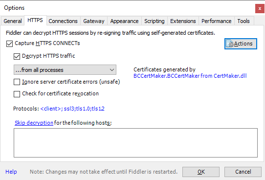 First, open the Fiddler options window and navigate to the "HTTPS" tab. There you will see which engine Fiddler is using for the certificates. Look for the text "Certificates generated by ...". Click the name of the engine if it is not set to "MakeCert" and set it. If you change this value, do not forget to restart Fiddler and regenerate your root certificate! Finally, close the Fiddler app.