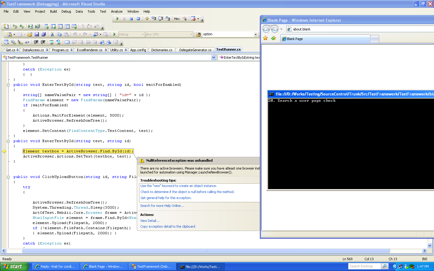 It says No Active browser were found.This happends only in IE my application runs well on Safari and Firefox.