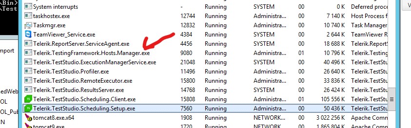 - If none of the above is applicable, please, trigger a test run through the Bamboo task and when you get to the state from the screenshot, open the Windows Task Manager. In its Details tab there should be a Test Studio process called Telerik.TestingFramework.Hosts.Manager - do you see such one?